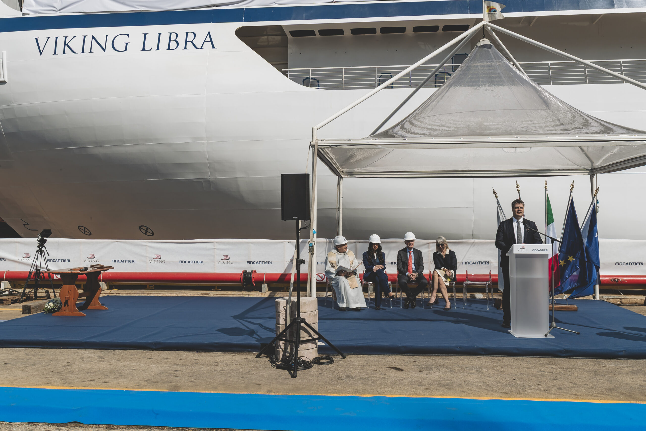 Enrico Prunotto, Viking’s Senior Vice President of Ocean Passenger Operation, thanks the shipyard at the float out ceremony—Credit Viking